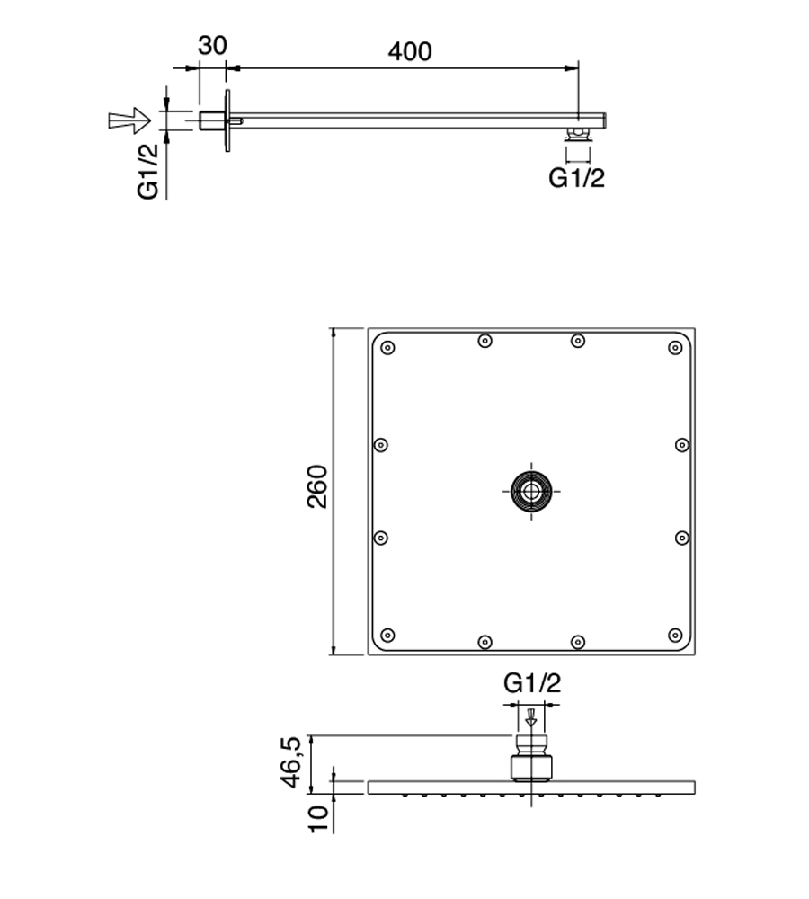 Braccio da 400mm con soffione anticalcare ispezionabile quadro 260 mm.