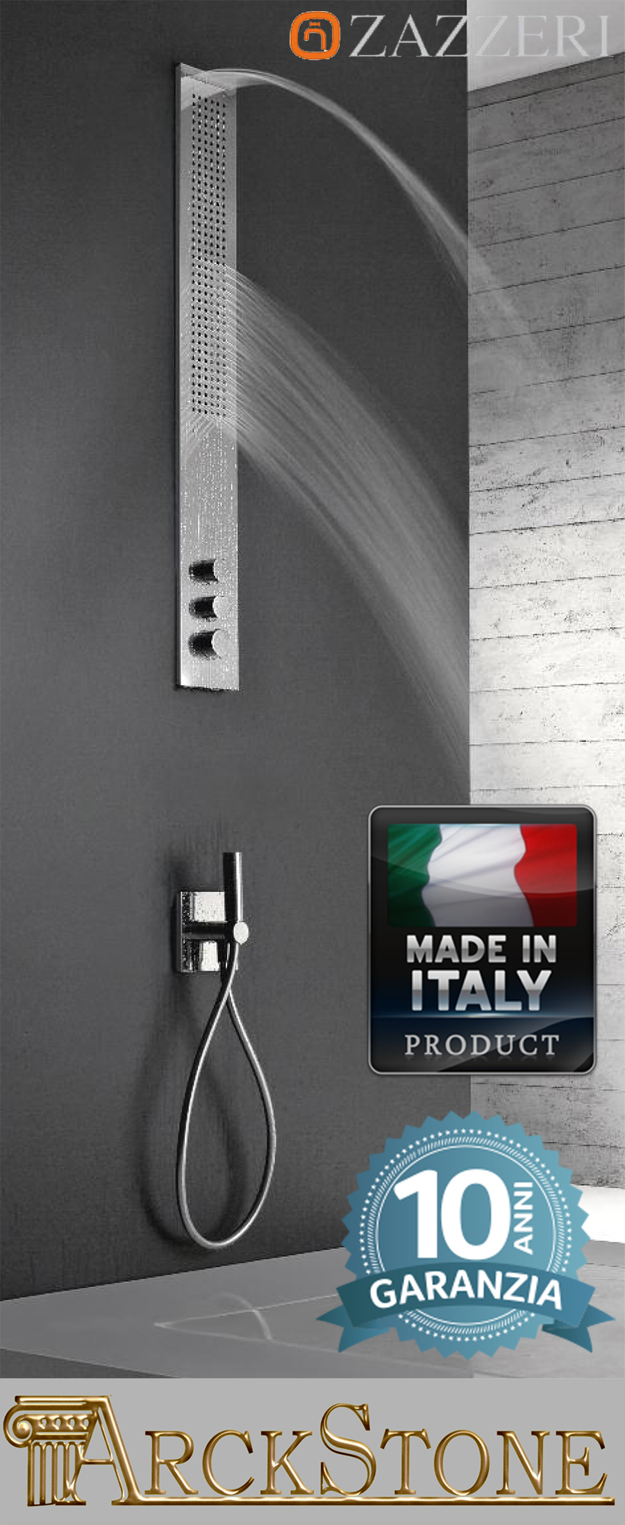 Colonna doccia due pezzi multifunzione attrezzata acciaio Inox Lucido marca Zazzeri modello Obliqua idromassaggio idro quattro uscite Flyfall incasso miscelatore rubinetto termostatica soffione piano anticalcare cascata bagno flessibile PVC getti