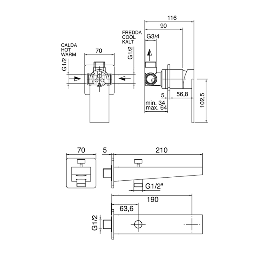 NB: Il collegamento idraulico fra miscelatore e getto deve essere realizzato in opera.
