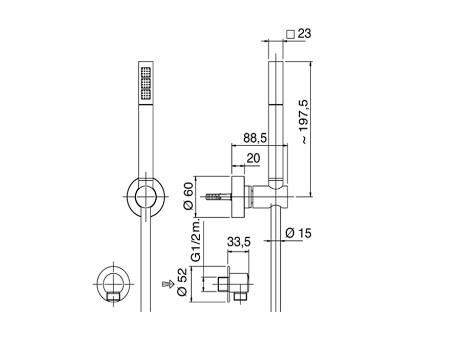 Set doccia con doccetta quadra, completo di presa acqua a muro e supporto.