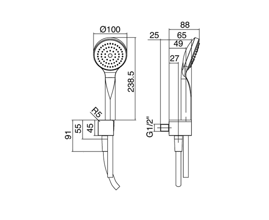 Set doccia con doccetta Ø100 mm completo di presa acqua a muro e supporto.