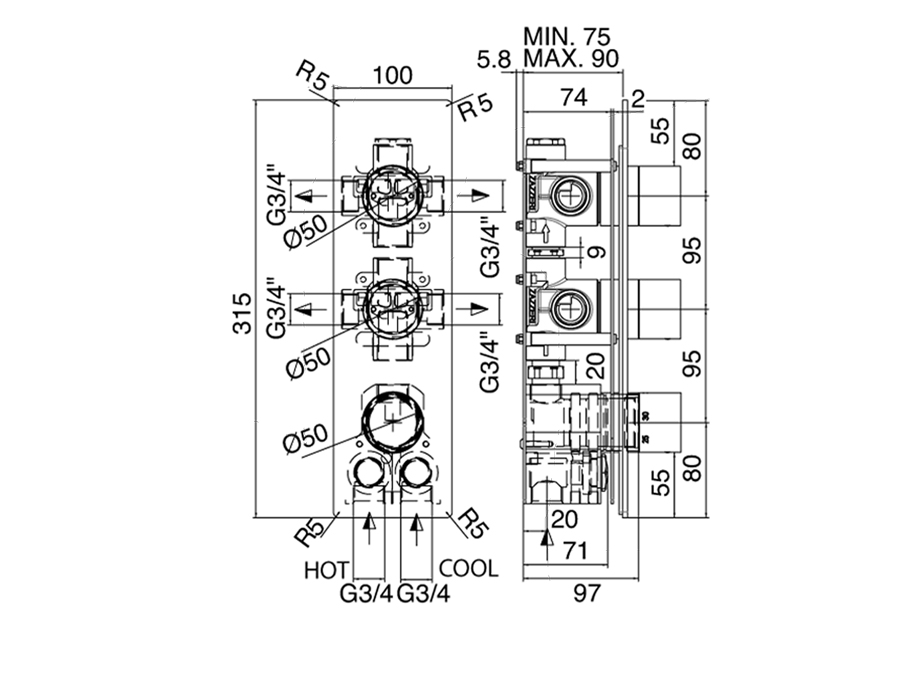 Gruppo termostatico SMART COMPATTO a 4 uscite ( 2 deviatori con stop ) - completo.