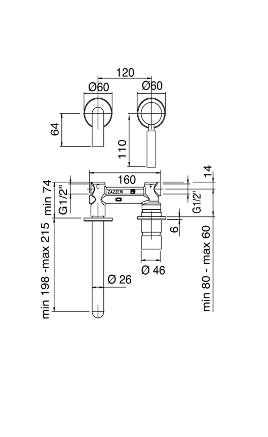 Miscelatore lavabo marca Zazzeri modello Da-Da 7 Mono finitura ottone cromato parete incasso getto 215 mm muro senza piastra arredamento casa arredo bagno azienda certificata garanzia 10 anni qualità made in italy