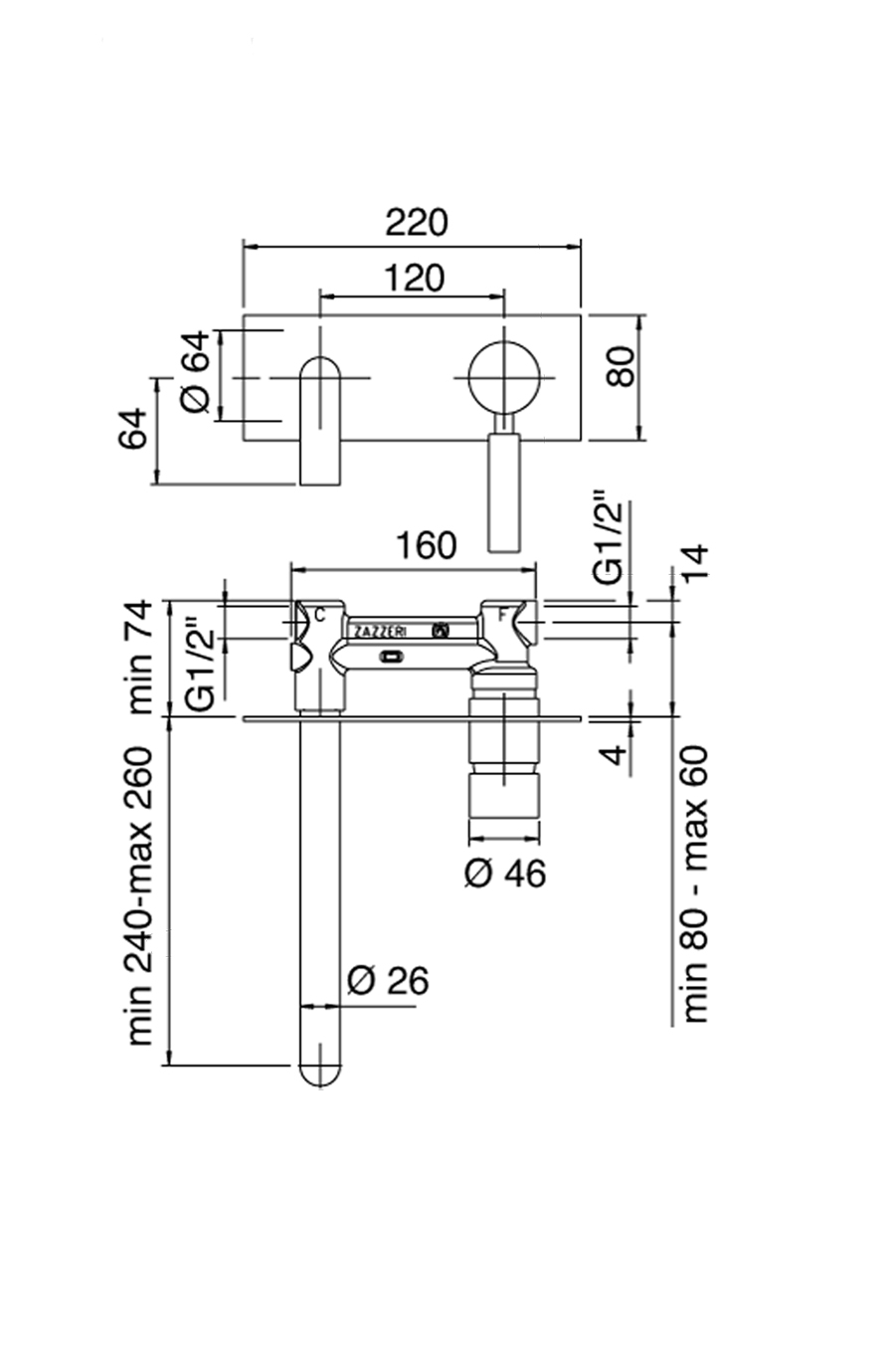 Miscelatore lavabo marca Zazzeri modello Da-Da 7 Mono finitura ottone cromato parete incasso getto 260 mm muro completo arredamento casa home arredo bagno azienda certificata garanzia 10 anni qualità made in italy