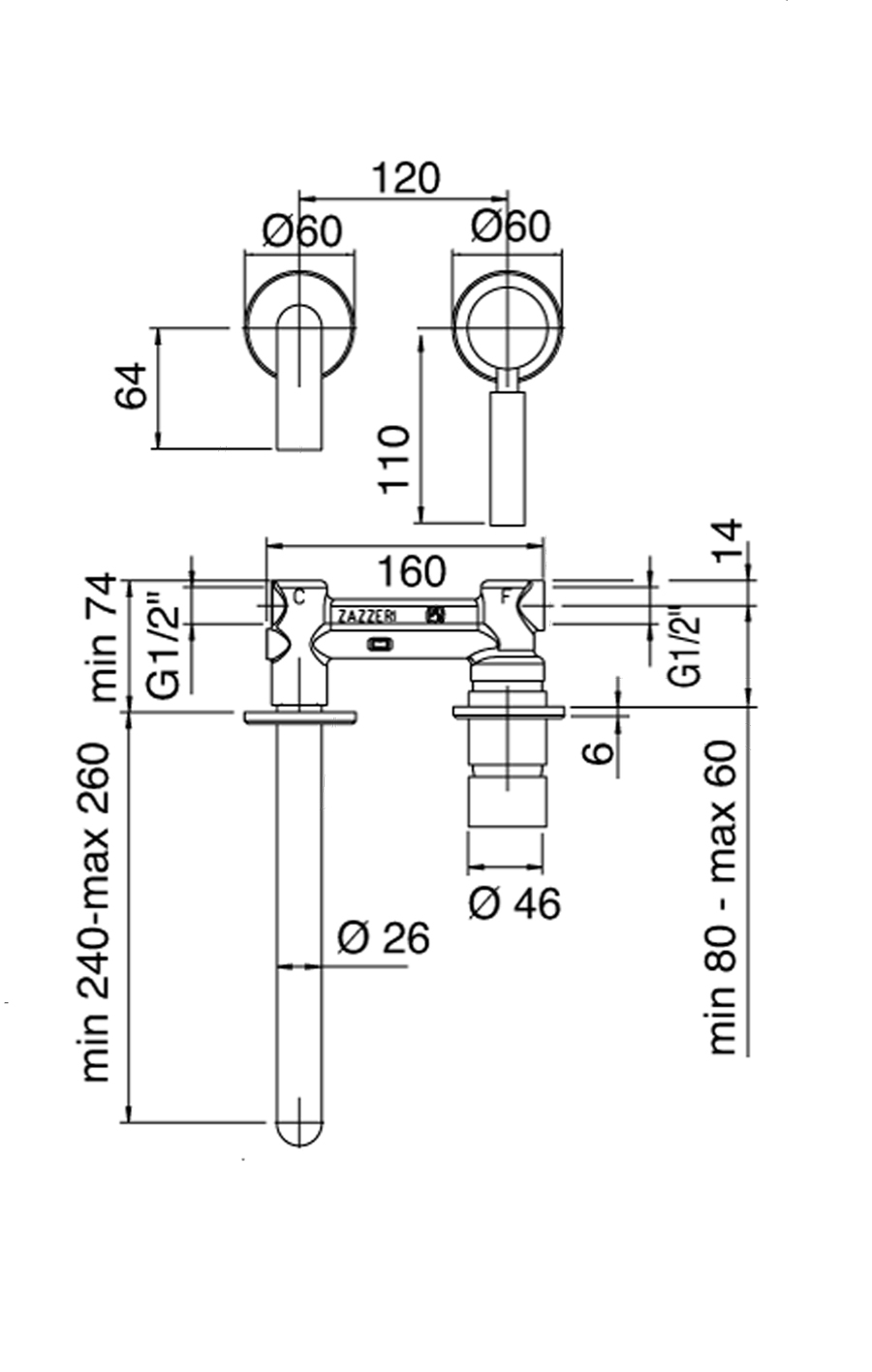Miscelatore lavabo marca Zazzeri modello Da-Da 7 Mono finitura ottone cromato parete incasso getto 260 mm muro senza piastra arredamento casa arredo bagno azienda certificata garanzia 10 anni qualità made in italy