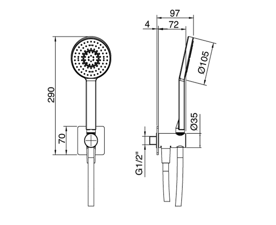 Modello: 100 - Set doccia: doccetta areata Ø105 mm, presa acqua e supporto